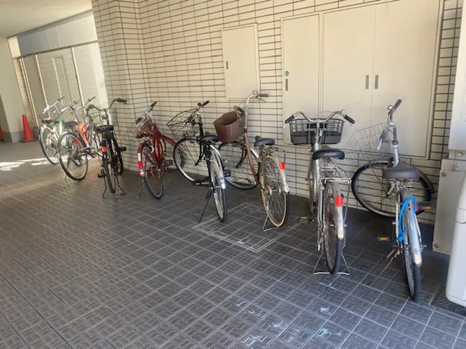 貸オフィス物件の入口周辺になります。正面入口右側の奥に機械式駐車場がございます。ターンテーブルがございますのでそのまま入れることが可能です。また、オフィスビルでは珍しい駐輪場もございますのでぜひご利用くださいませ。