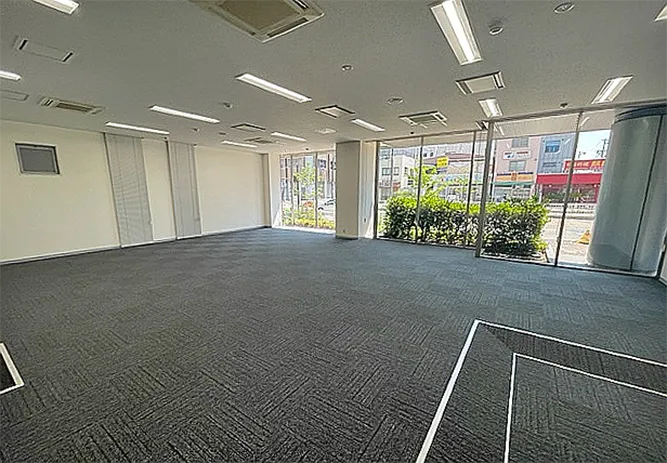 OAフロア完備で天井も高く、通り側はガラス貼りになっている明るい部屋です。