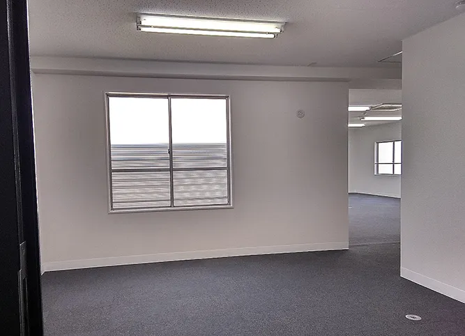入口ドアを入ったところ。受付スペースとしての前室があり、奥に事務スペースがとれるような間取りです。