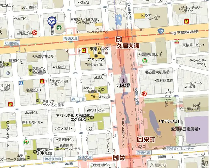 今回の貸事務所物件は最寄り駅が「久屋大通駅」ですが、徒歩圏内で「栄駅」まで行くことも可能となります。また、士業の方には好立地の三の丸に近いエリアになります。