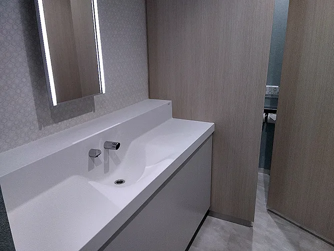 大きめの手洗いミラーには女性に優しいメイクのためのライトがついています。